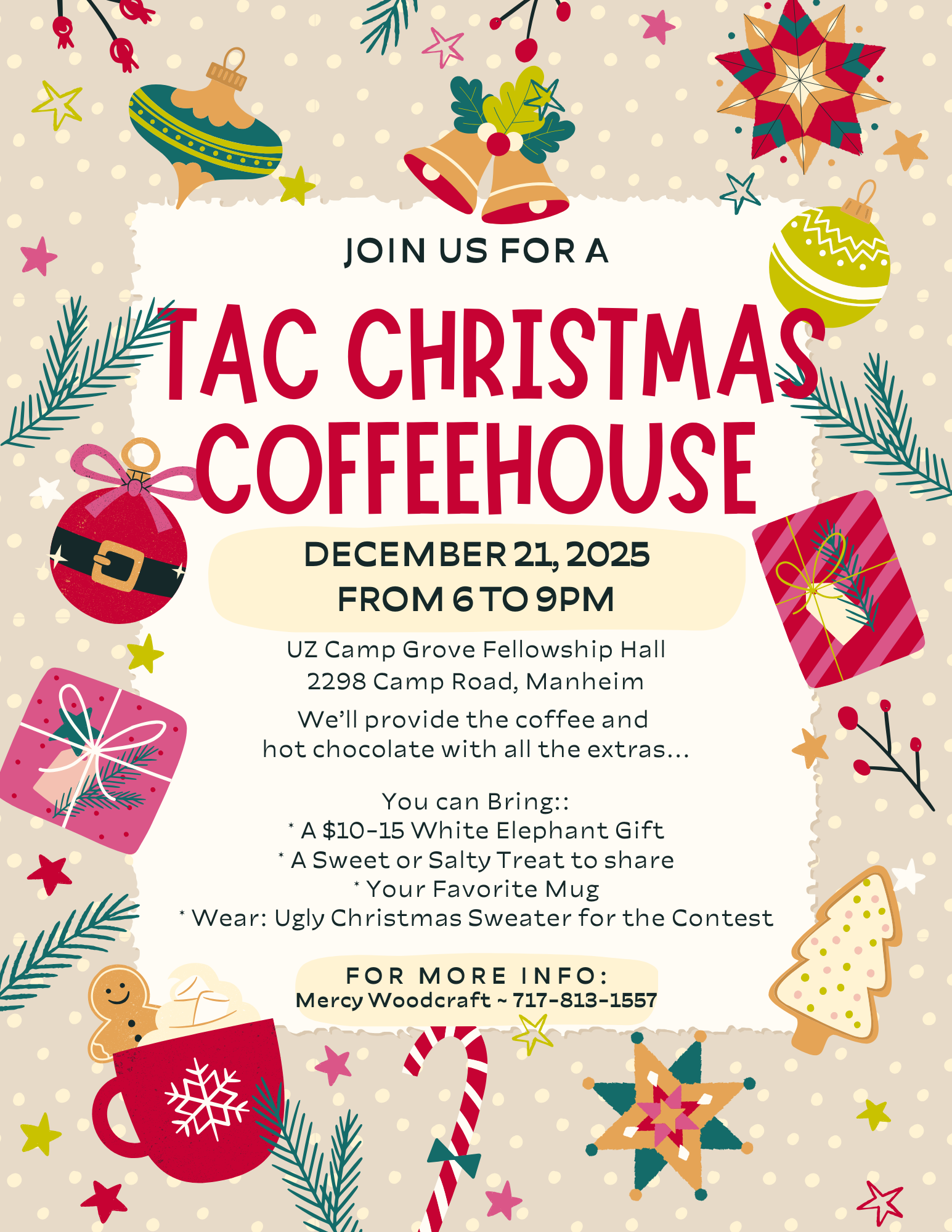 Sunday, December 14 at 6:30 pm ~ at Hahnstown UZ (900 Glenwood Drive, Ephrata) will have a Christmas Chalk Talk with Kathy Ebling and a Christmas Carol Sing-Along with Don…